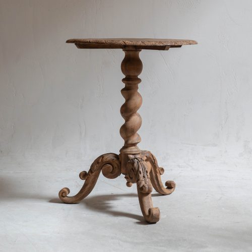 Velador antiguo de madera. Elaborado artesanalmente en madera maciza con bonitos detalles ornamentados, es una sutil pieza cuyo tablero redondo descansa sobre una columna torneada, que aporta dinamismo y volumen, que culmina en tres patas bellamente ornamentadas. Un elemento decorativo que añade un toque de encanto y elegancia a cualquier espacio.