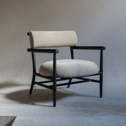 Sillón de madera y lino. Elegante, con un diseño minimalista y sofisticado, aporta un toque de estilo y confort a cualquier espacio. Su estructura de madera oscura y líneas limpias se combinan perfectamente con el asiento y respaldo tapizados en un lino de suave tono beige, creando una armonía visual que se adapta a una amplia gama de estilos decorativos.